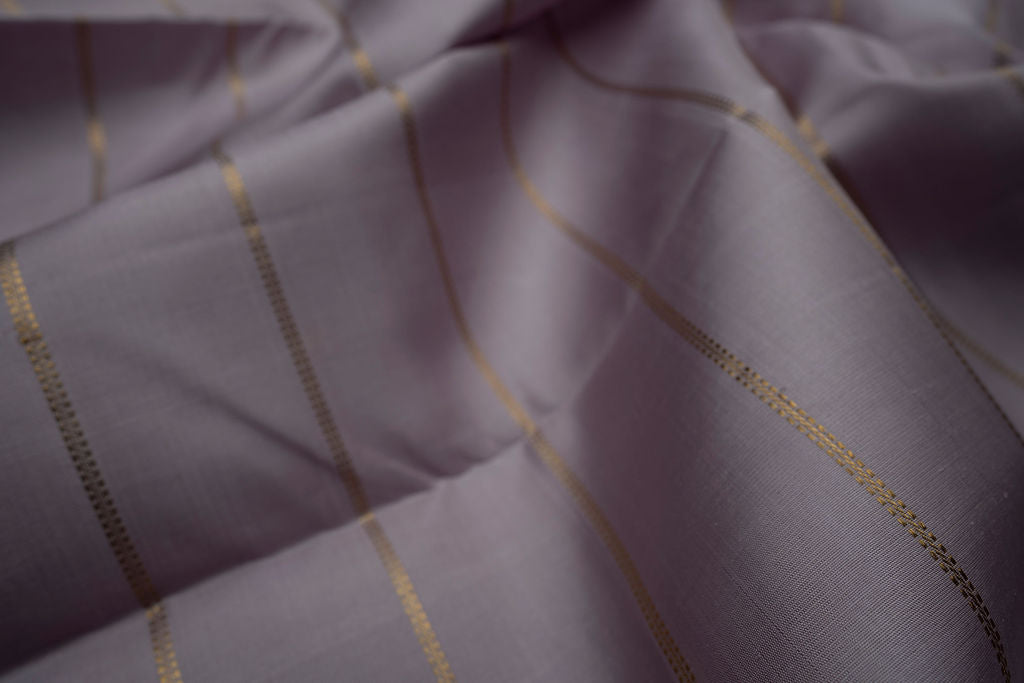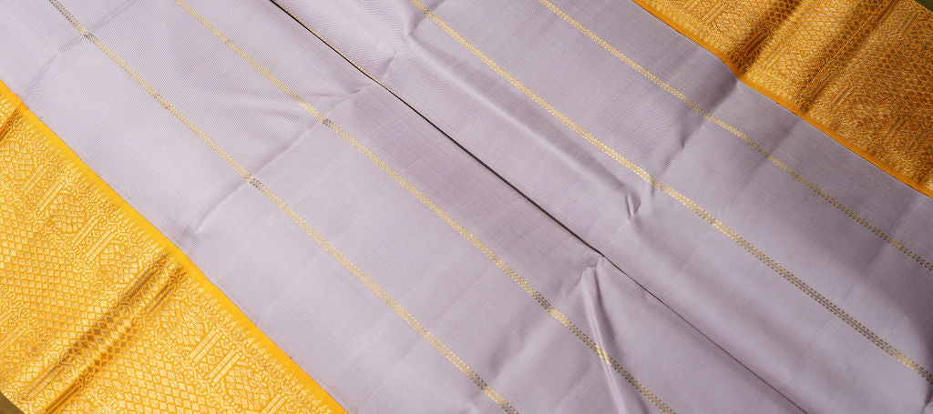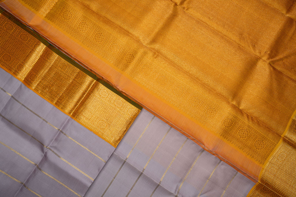 Embrace the beauty of tradition with this elegant grey and mustard Kanjivaram silk saree. The soft grey body, adorned with delicate gold zari stripes, offers a contemporary yet graceful appeal.