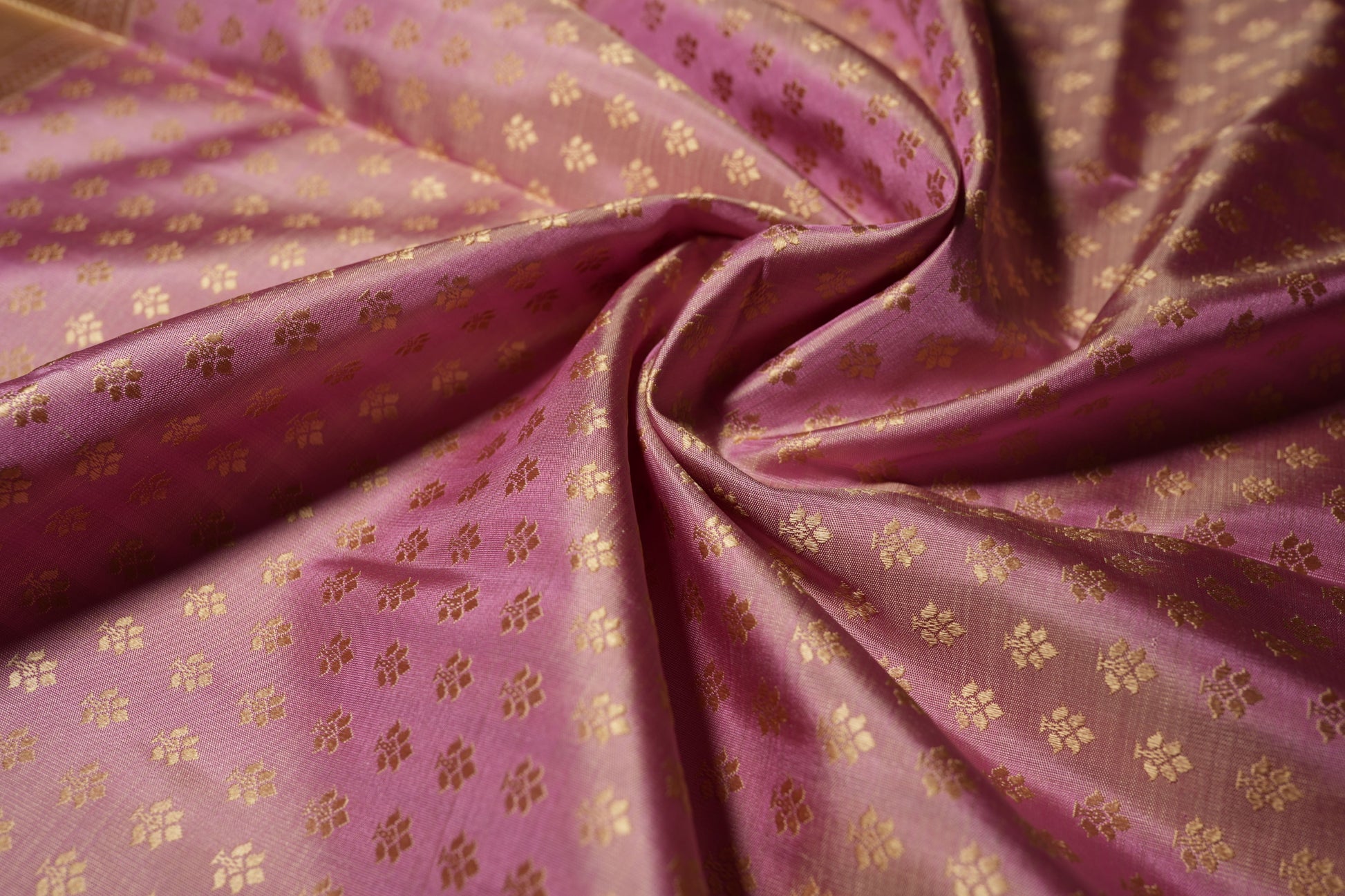 Gracefully understated yet richly detailed, this handwoven silk saree showcases a soft dusty mauve body, beautifully adorned with neatly spaced traditional zari floral buttas. The subtle sheen of the silk combined with the warm gold highlights creates a look of quiet luxury and timeless sophistication.