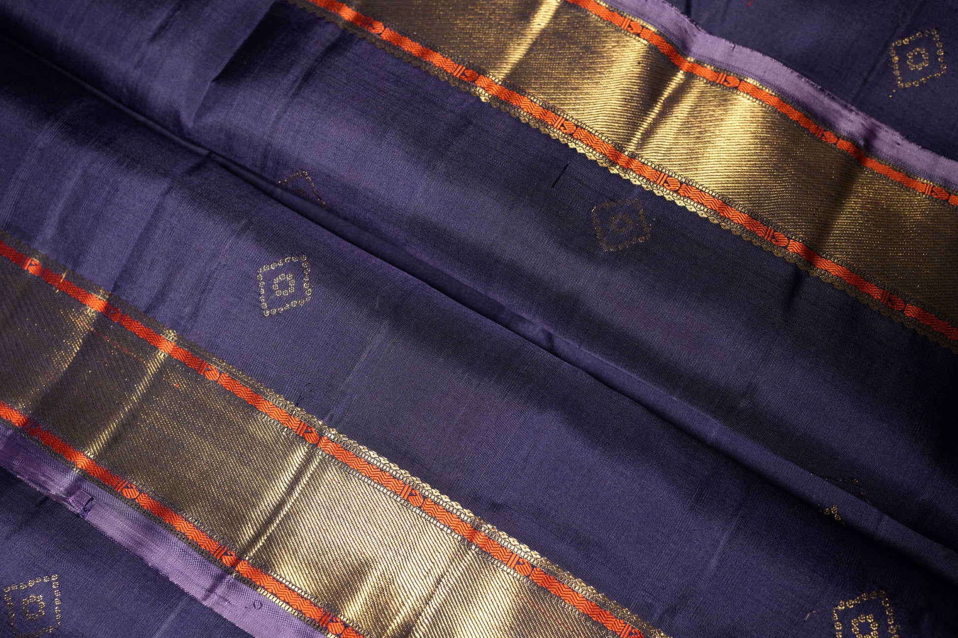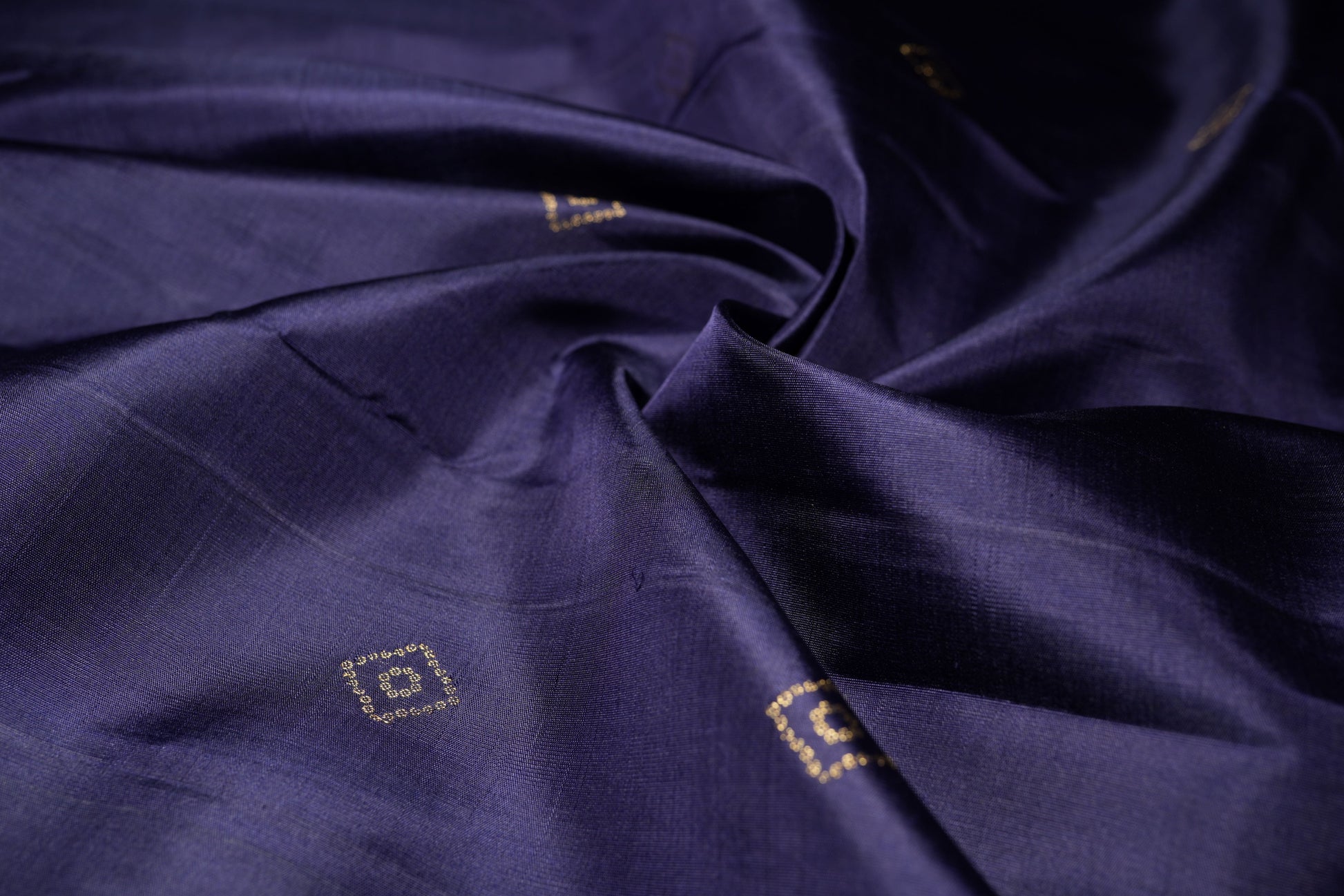 Classic elegance meets traditional craftsmanship in this exquisite handwoven silk saree, featuring a rich deep navy blue body subtly adorned with geometric zari buttas woven in antique gold. The understated motifs add quiet sophistication while allowing the depth of the silk to shine through.