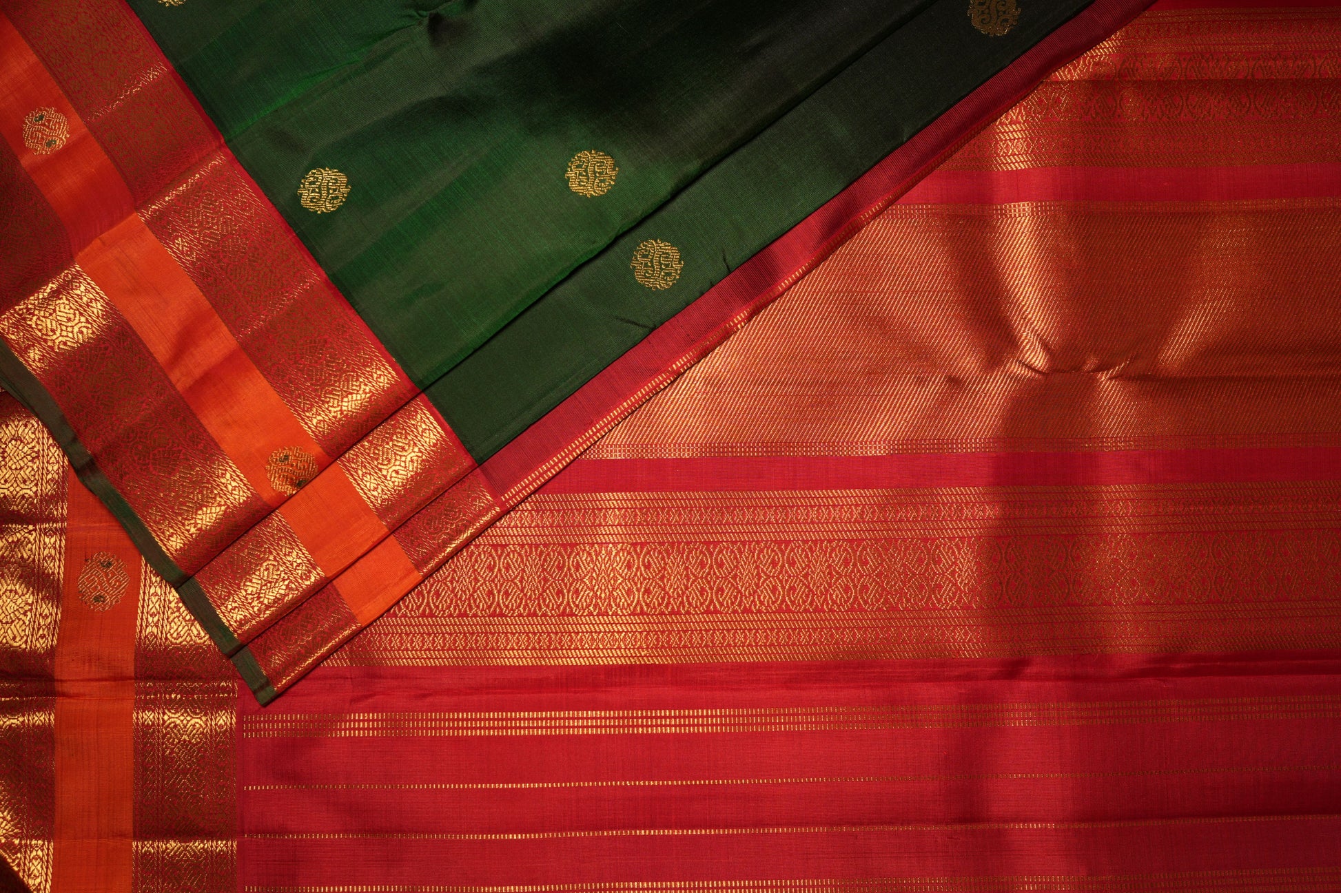 Emerald Green Kanjivaram Silk Saree with Gold Zari Buttas & Red Contrast Border
