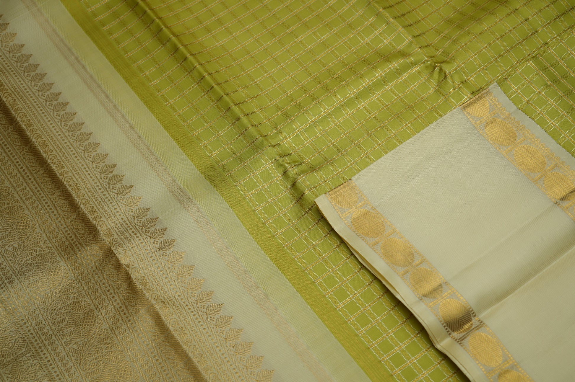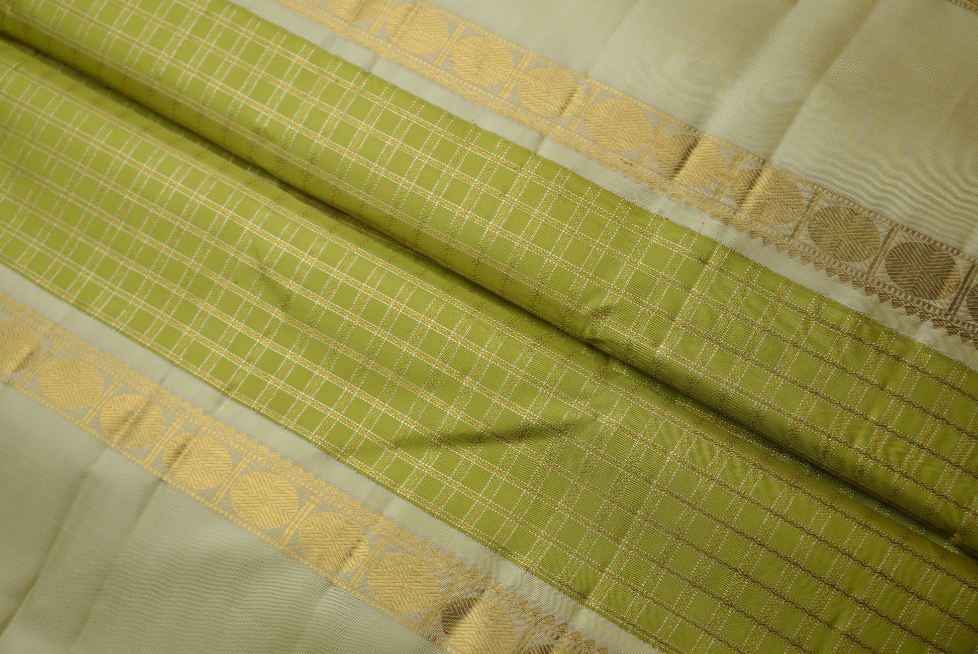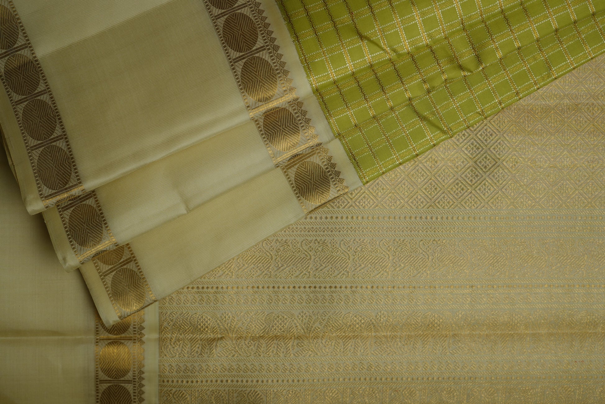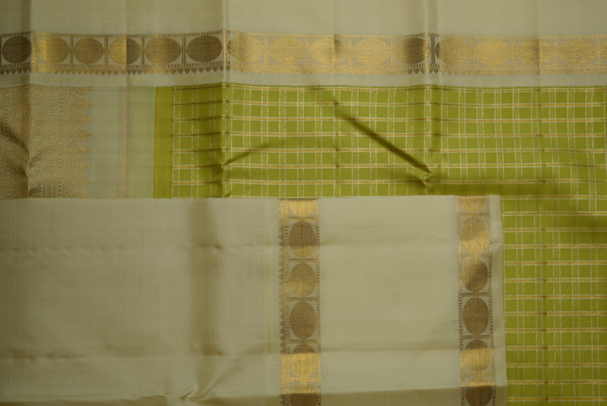 A mesmerizing blend of subtle elegance and timeless craftsmanship, this handwoven silk saree is a masterpiece of grace. The soft ivory body is adorned with intricate gold motifs, exuding a regal charm. The contrast green pallu features delicate gold checkered zari work, adding a contemporary touch to the traditional weave.