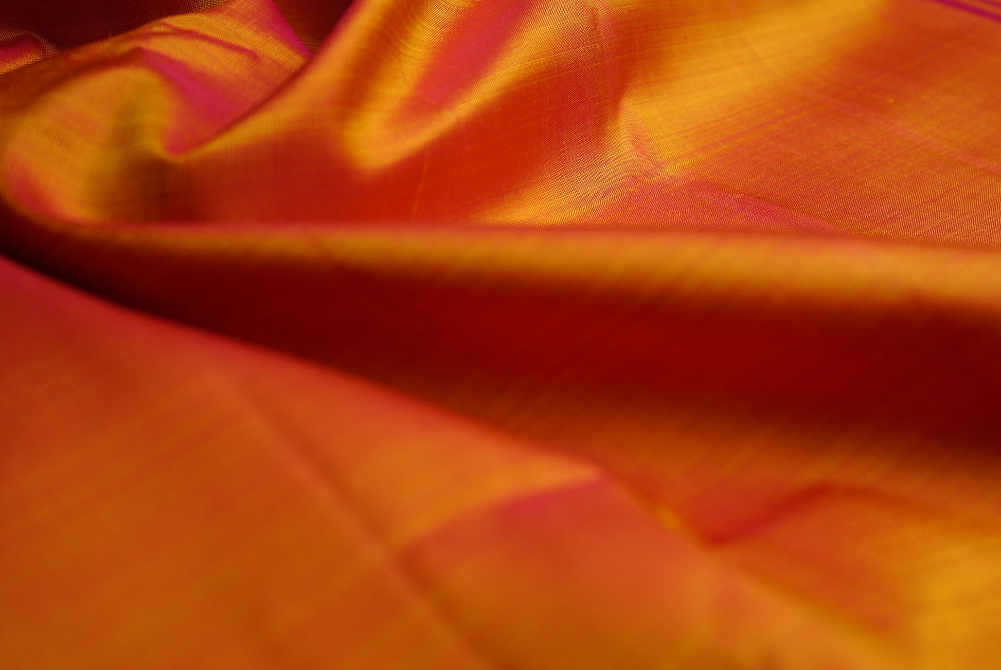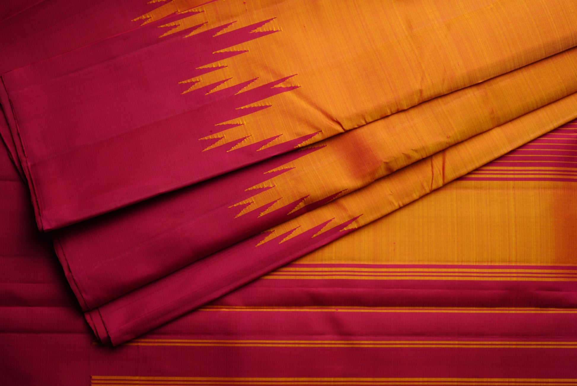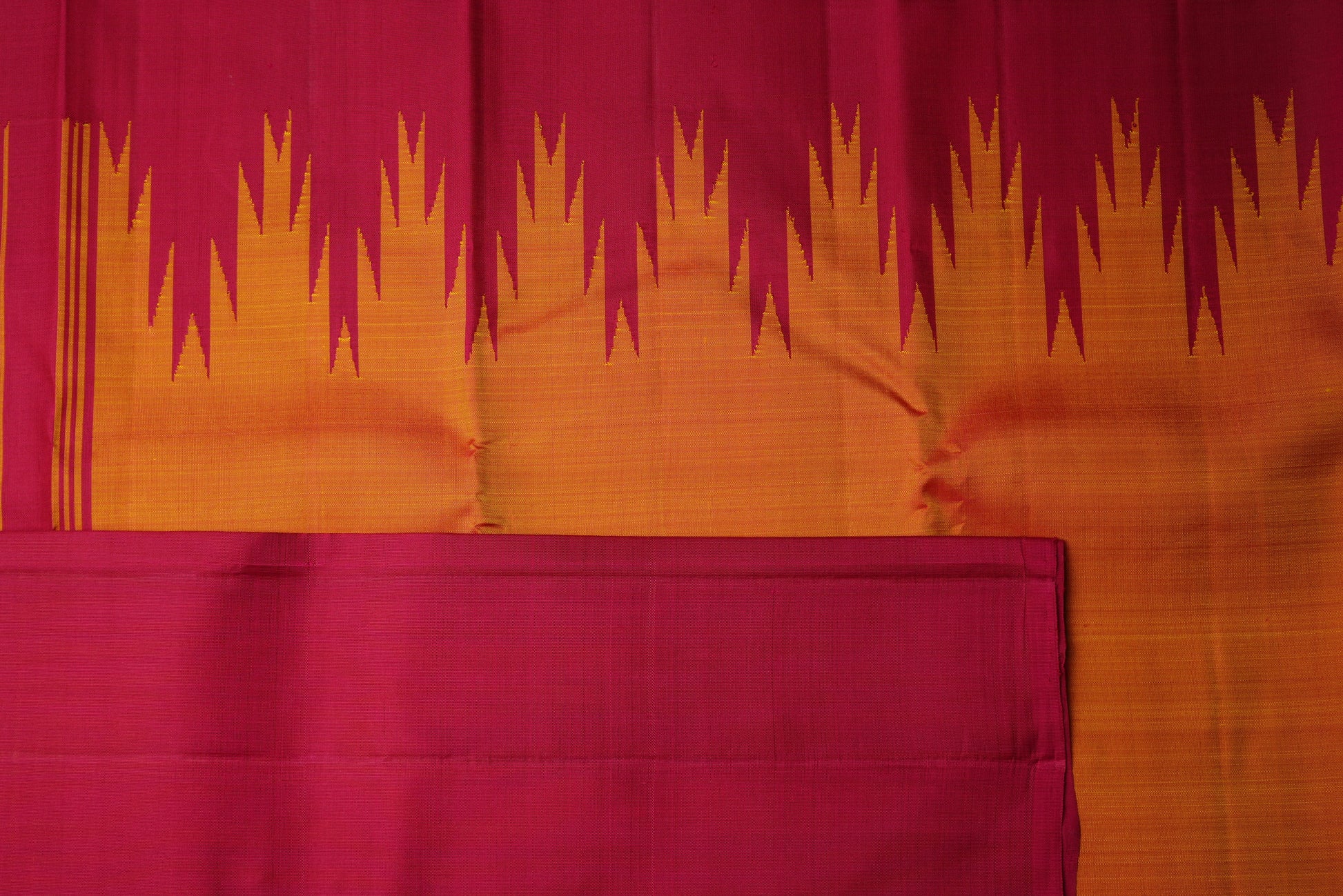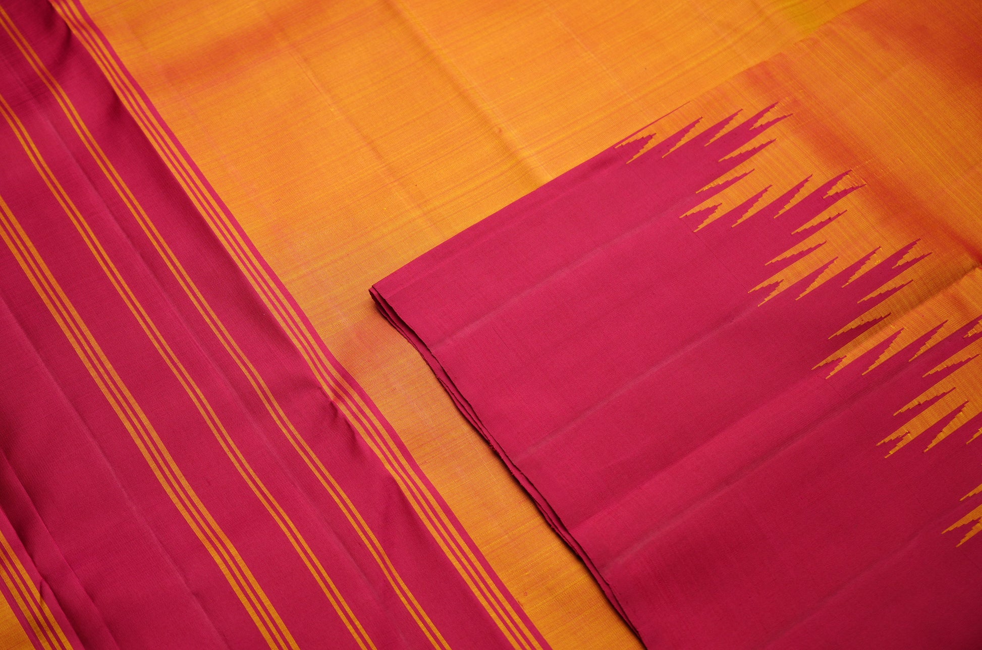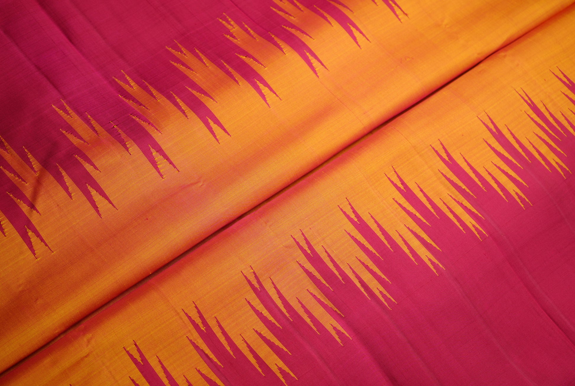 A bold celebration of color and craftsmanship, this handwoven silk saree brings together timeless tradition with contemporary flair. The rich magenta body beautifully complements the sunset-orange pallu, adorned with signature temple-inspired patterns that rise like flames—symbolizing divinity and power.
