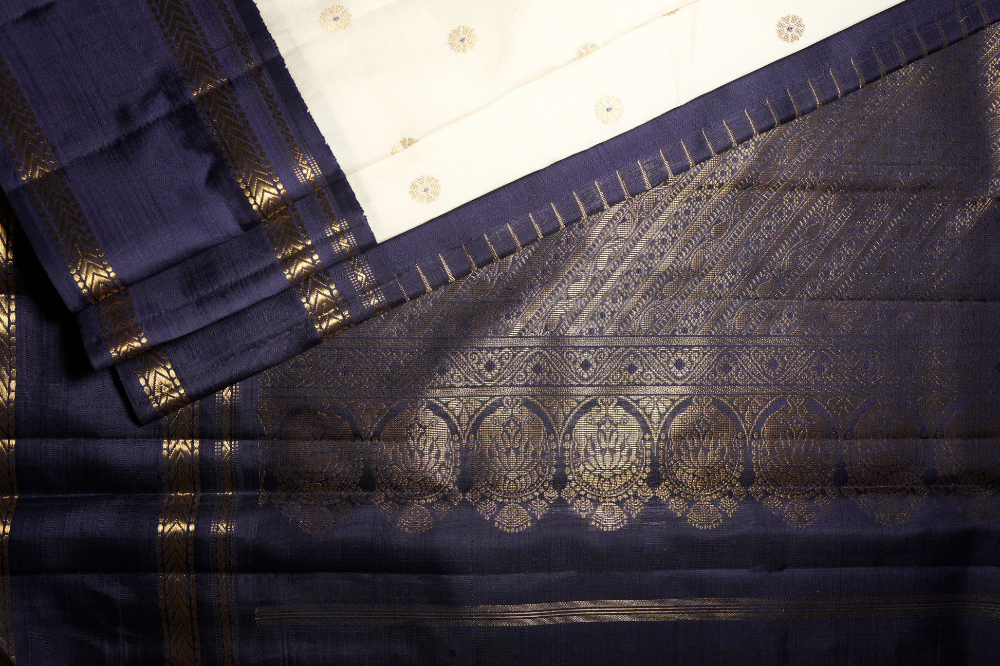 Ivory White & Navy Blue Kanjivaram Silk Saree with Gold Zari Buttas and Regal Brocade Pallu